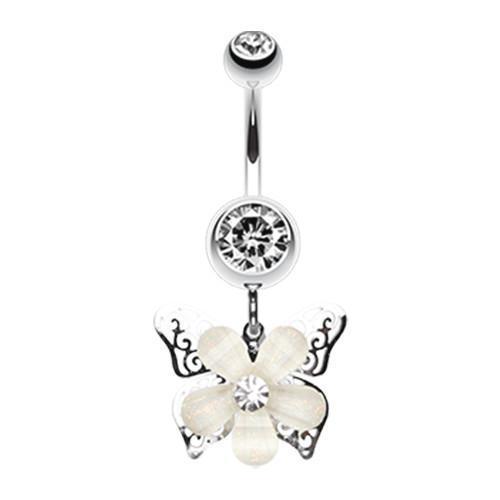 Clear Glittered Flower Butterfly Dangle Belly Ring